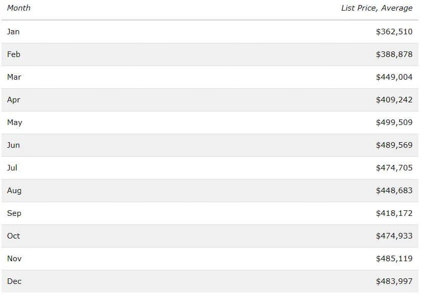 • Average List Price Change by Month: At the bottom of the page there is a table of average list prices by month.